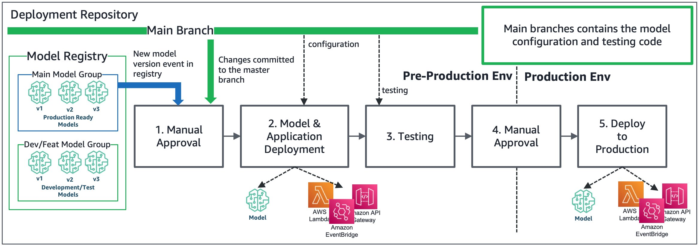CI/CD pipeline to promote a model and the infrastructure to trigger the model endpoint, such as API Gateway, Lambda functions, and EventBridge