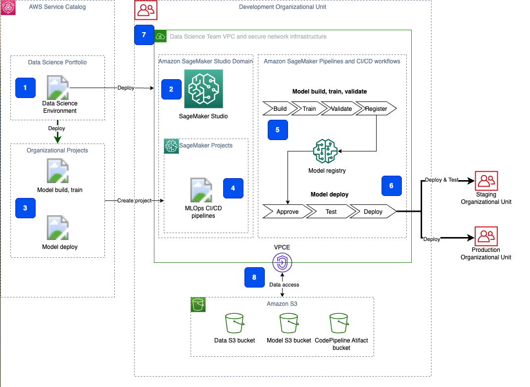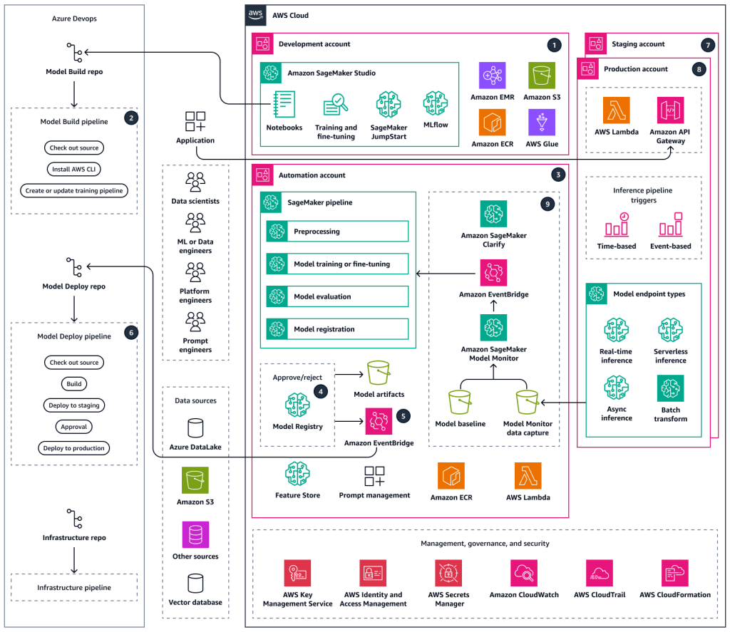 | 3 – Reliable | Pre-Production & Testing | Models are deployed first in staging, full testing introduced (integration, performance, ML tests). | Multi-account setup, automatic tests, manual approvals, blue/green or canary rollout. |