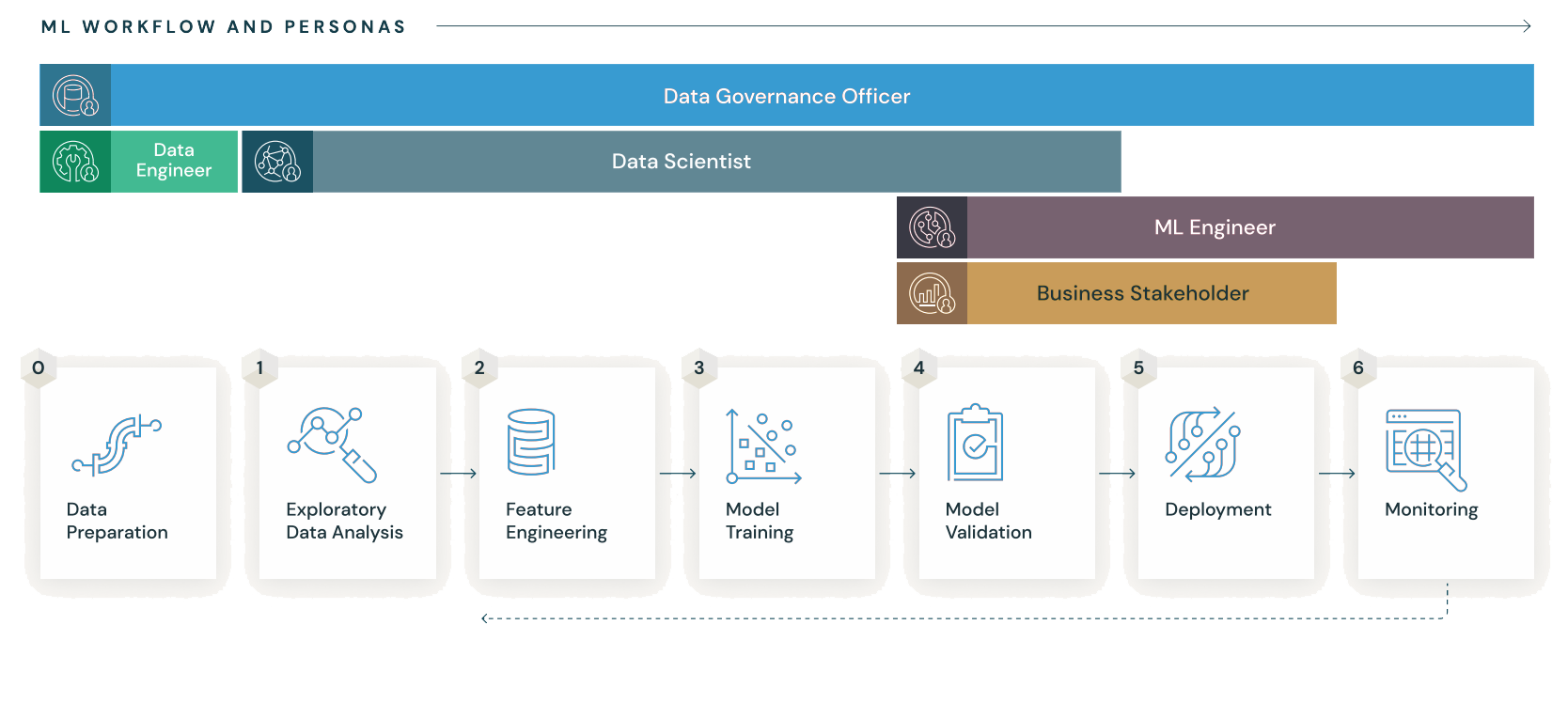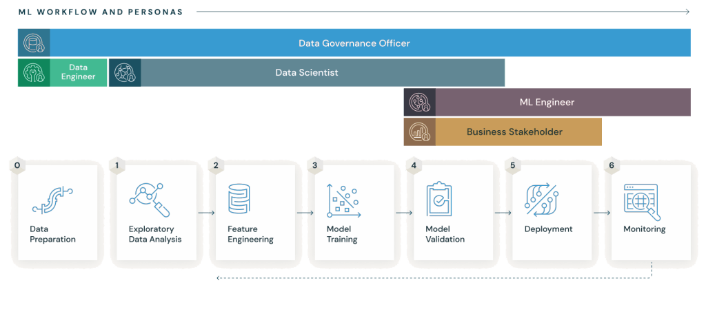 Every ML journey passes through six iterative phases. Each phase contributes artifacts, metadata, and governance checkpoints that feed the next.