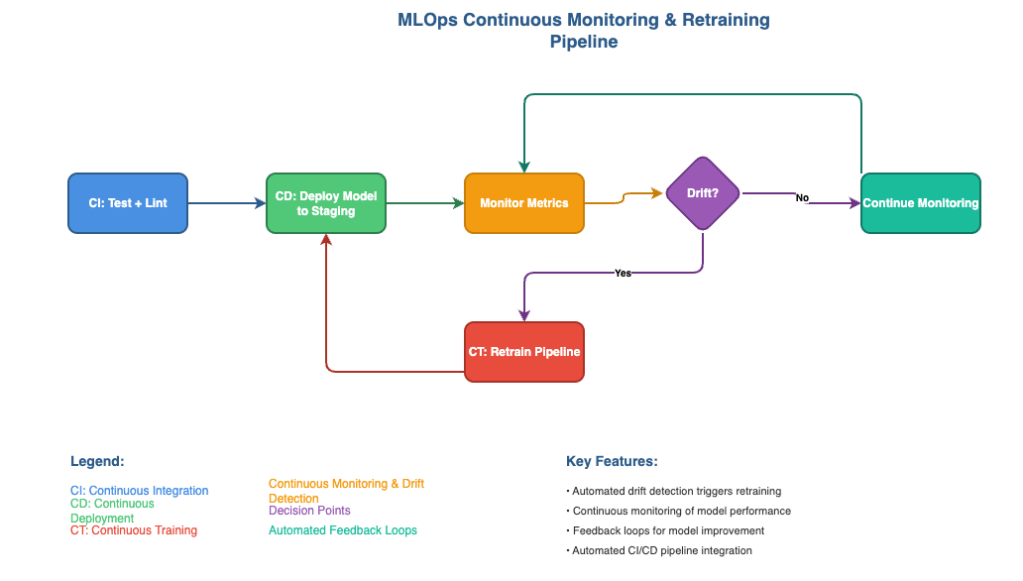 - Evidently/Deepchecks jobs compare live vs. training distributions; results posted to a dashboard and stored with run metadata. * When drift crosses thresholds, an EventBridge trigger or Kubernetes CronJob launches retraining — restarting the loop.