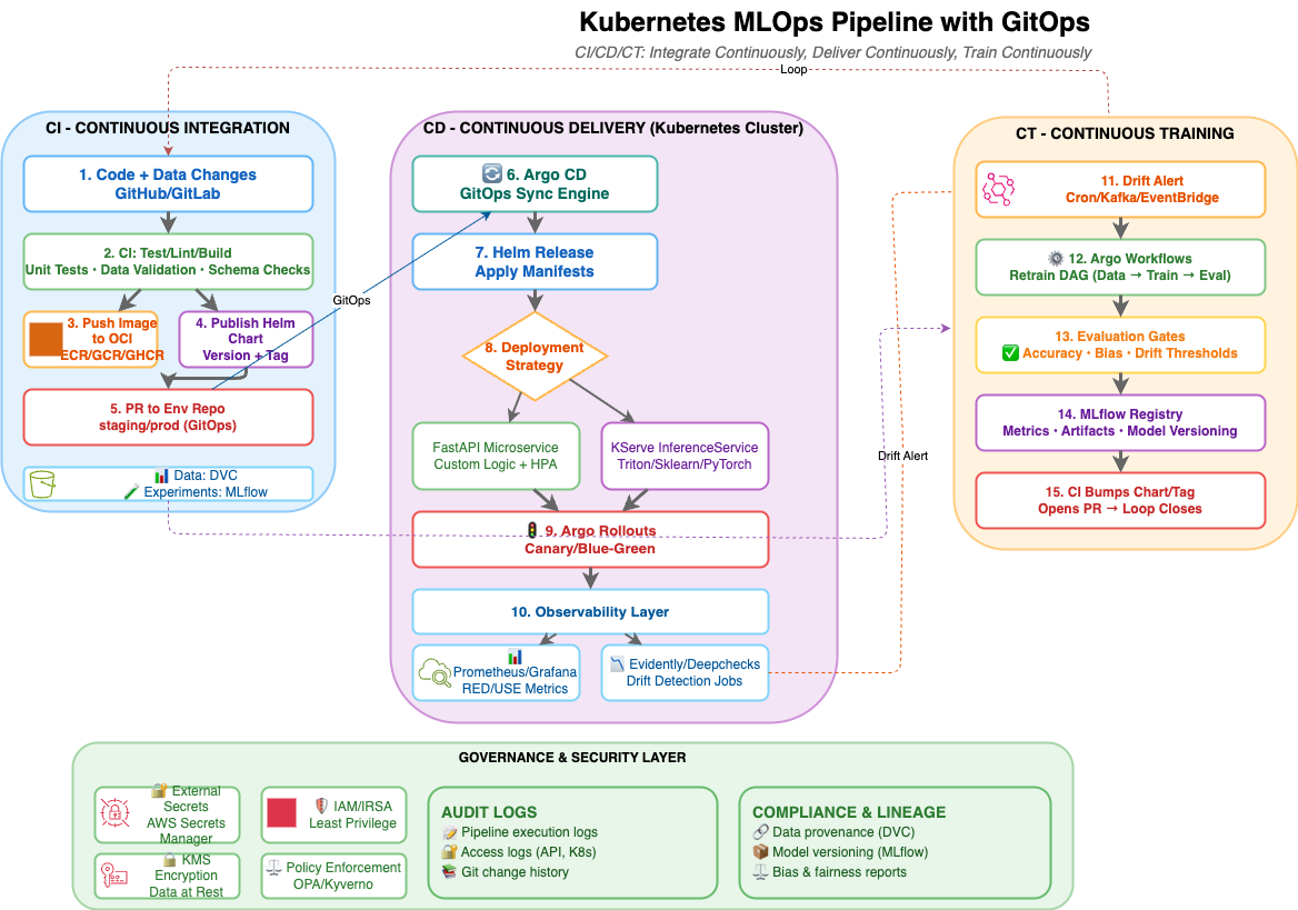 - Eventing (CT): Cron or Kafka/NATS → Argo Workflows trigger retraining