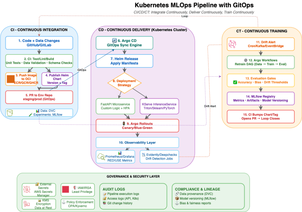 Picture your pipeline as code, versioned and observable: data validation jobs run as Argo Workflows, images build in CI, and deployments sync automatically through Argo CD. KServe or FastAPI hosts inference services, while Prometheus and Evidently feed live metrics into dashboards. When drift alerts fire, Argo Workflows retrains and re-registers the next candidate.