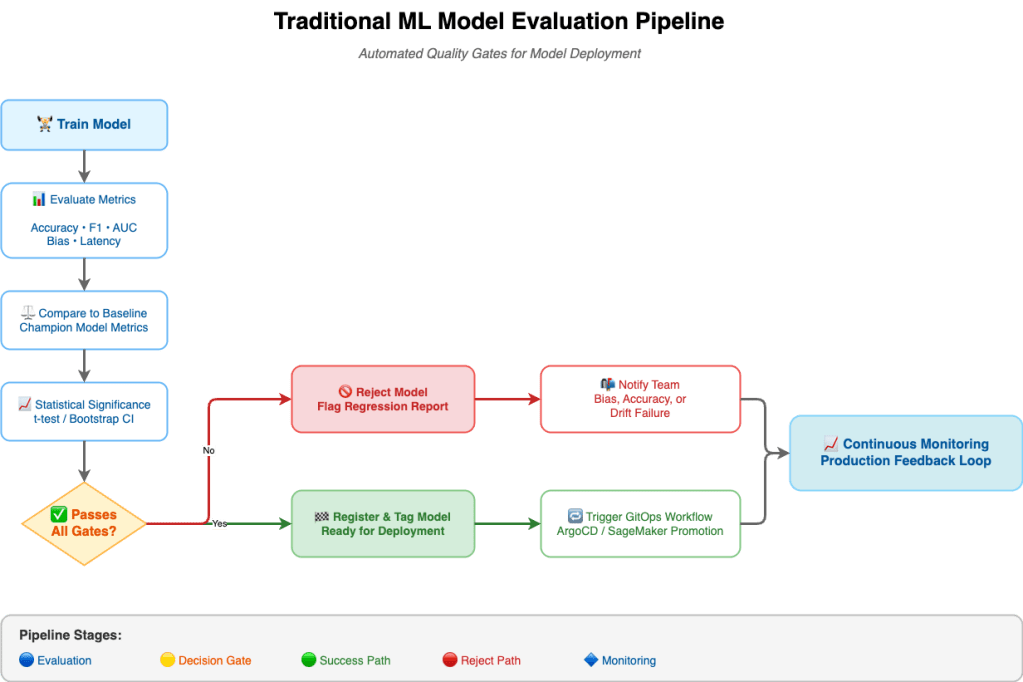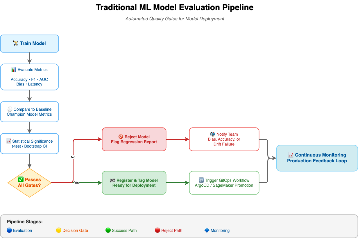 Modern pipelines go further — comparing models statistically, ensuring no regression, and validating business relevance.