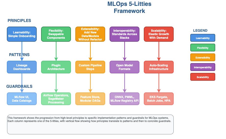 | Flexibility (allows you to adapt quickly without rewriting the foundation) | Swap tech with minimal blast radius | Containerized steps, strict interfaces, parameterized configs | Kubernetes, Helm/Kustomize, Airflow/Kubeflow, SageMaker Pipelines |