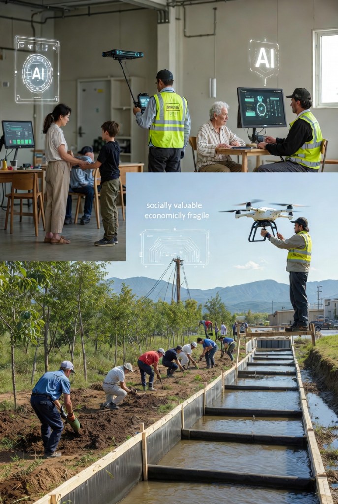 This isn’t the old image of useless bureaucracy. It’s framed as national resilience. People are hired into roles that are socially valuable but economically fragile: climate adaptation projects, elder care support, local infrastructure maintenance, education assistants, public data stewardship, community health outreach. AI is everywhere; but humans are kept “in the loop” by design.
