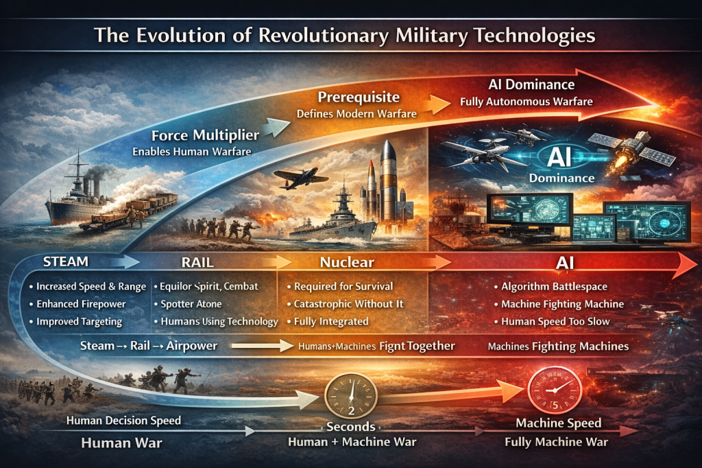 On the arc of this technology. Every major enabling technology in warfare follows a pattern: force multiplier → prerequisite → primary terrain. Steam, rail, airpower, nuclear — each one rewrote the rules of who could threaten whom and how fast. AI is following that arc. We’re somewhere between force multiplier and prerequisite right now. The question isn’t whether that changes the nature of conflict. It already has. The question is what comes after the upgrade finishes installing.