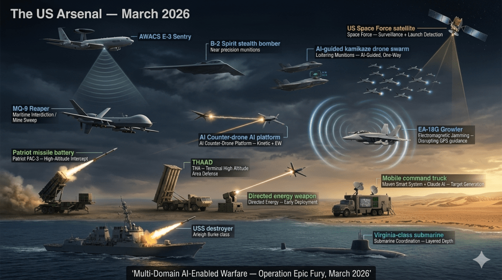 In Operation Epic Fury — the US-led strikes against Iran beginning in early March 2026 — that compression became visible at scale. AI tools helped American forces identify and hit more than 5,500 targets inside Iran, according to Admiral Brad Cooper, head of US Central Command (DefenseScoop, March 2026). The backbone is Palantir’s Maven Smart System, now operating alongside Anthropic’s Claude under a $200M DoD contract active since 2024. On day one of operations alone, Claude generated approximately 1,000 prioritised targets — synthesising satellite imagery, signals intelligence, and surveillance feeds in real time, outputting GPS coordinates, weapons recommendations, and automated legal justifications for each strike (CBS News, March 2026).