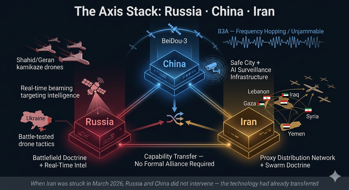 Iran brings the proxy network and the doctrine. Russia and China have technology and resources. Iran has geographic reach — a proven network of proxy forces across Lebanon, Iraq, Yemen, Syria, and Gaza, each now receiving drone training and swarm tactics. That distribution layer means the technology doesn’t stay contained to the Iranian military. It propagates outward through proxy actors, each of whom operate with a degree of deniability that makes conventional deterrence harder to apply.